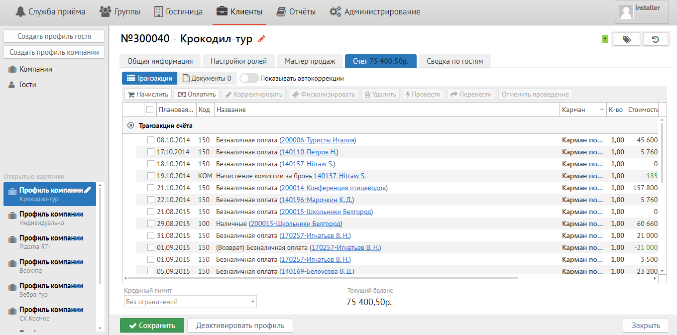 “Show closed” – allows to see all closed profiles of guests and companies.