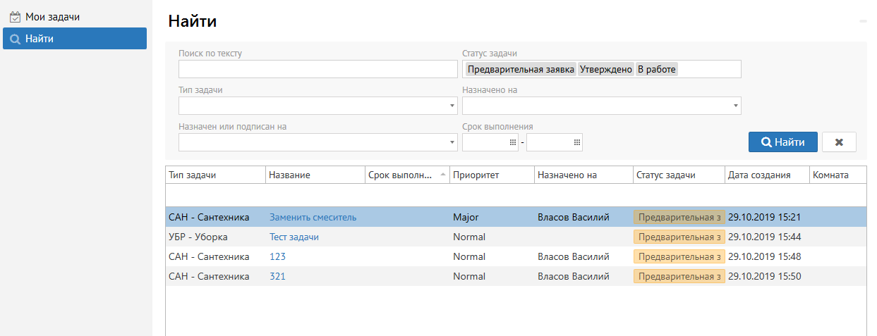 В данном разделе по умолчанию отображаются все активные задачи.