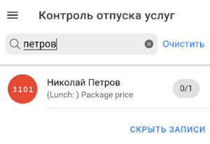Функционал отображает и позволяет отпускать услуги питания на текущий день. Состоит функционал из двух экранов. Экран поиска и экран детализации.