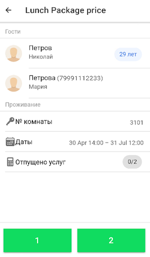 Сдвинув плашку гостя влево, появляется возможность быстро отпустить все услуги питания по данной брони. В данном случае в брони два гостя, значит будет отпущено сразу две услуги питания.