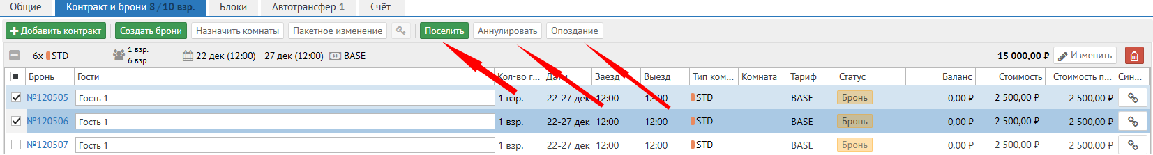 Предварительно Вам необходимо создать контракты в данной групповой брони: Каждый контракт создается на определённую категорию номеров, и даты проживания. Например, часть людей необходимо будет поселить в люкс, а часть в стандарт - Вам необходимо будет создать два контракта.