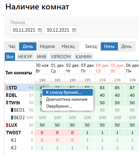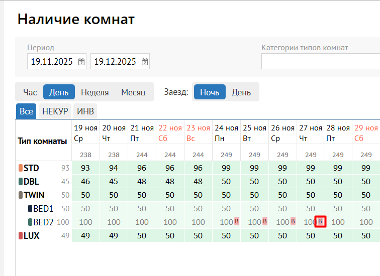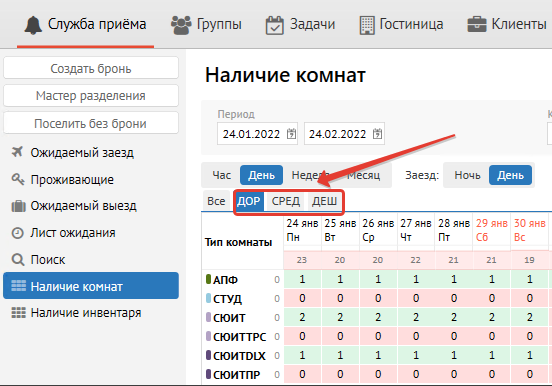 ВНИМАНИЕ! По умолчанию таблица наличия комнат открывается по дням!