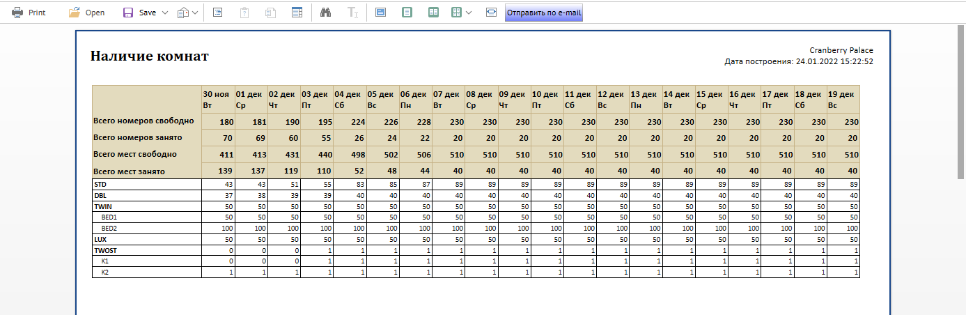 На вкладке “Наличие комнат” есть возможность распечатать таблицу наличия. Для этого необходимо выбрать необходимые фильтры, настроить переключатели для отображения детальной информации и нажать на кнопку “Распечатать”.