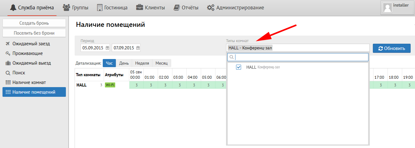 Поле наличия помещений окрашено в 2 цвета: зеленый и красный. В них указывается количество свободных помещений на дату.