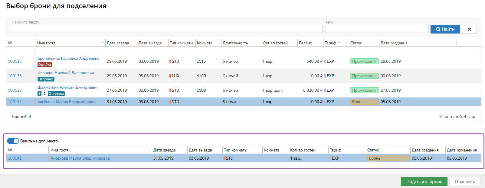 При нажатии на кнопку "Подселить бронь" найденная бронь добавляется в разделение счетов к исходной. Если у неё был другой тип номера/комната, они меняются начиная с текущего дня.