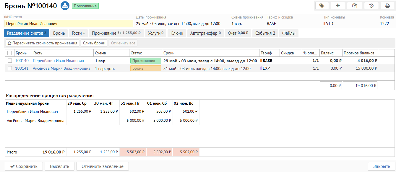 Начиная с версии 2.4 стало возможным "подселение", то есть поселение двух не связанных броней в один номер. При этом бронь добавляется в разделение счетов с прежней стоимостью.