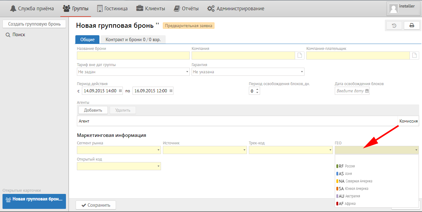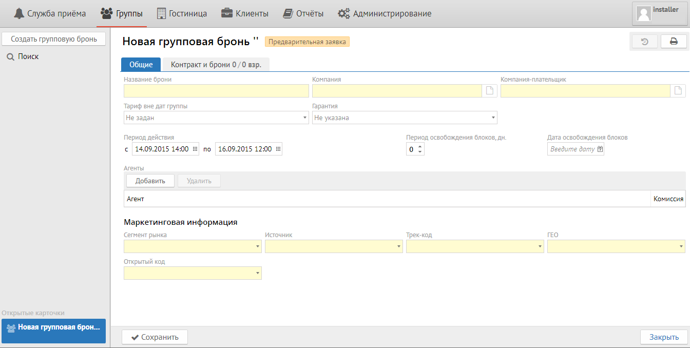 Важно: сколько в группе вариантов размещения (даты, типы номеров, количество номеров), столько контрактов должно быть в группе.