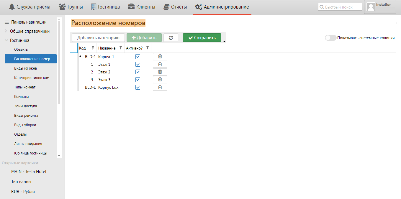 Расположение номеров - здесь указываются корпуса и этажи вашей гостиницы. Для того, чтобы добавить новое расположение номера, необходимо нажать кнопку "Добавить" и далее кнопку "Сохранить":
