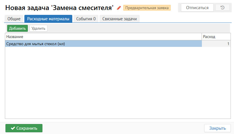 При выборе типа задачи в раздел расходных материалов автоматически добавятся те материалы, которые заданы в настройках выбранного типа. Их количество и расход можно изменить. Так же есть возможность добавить новые или удалить существующие.