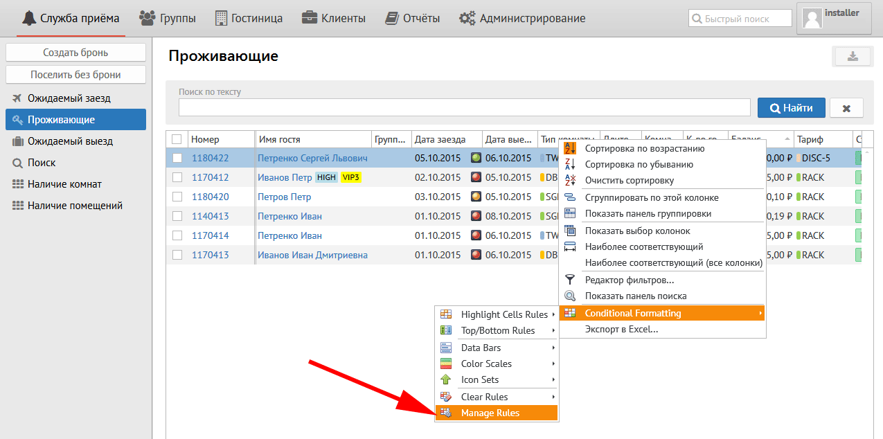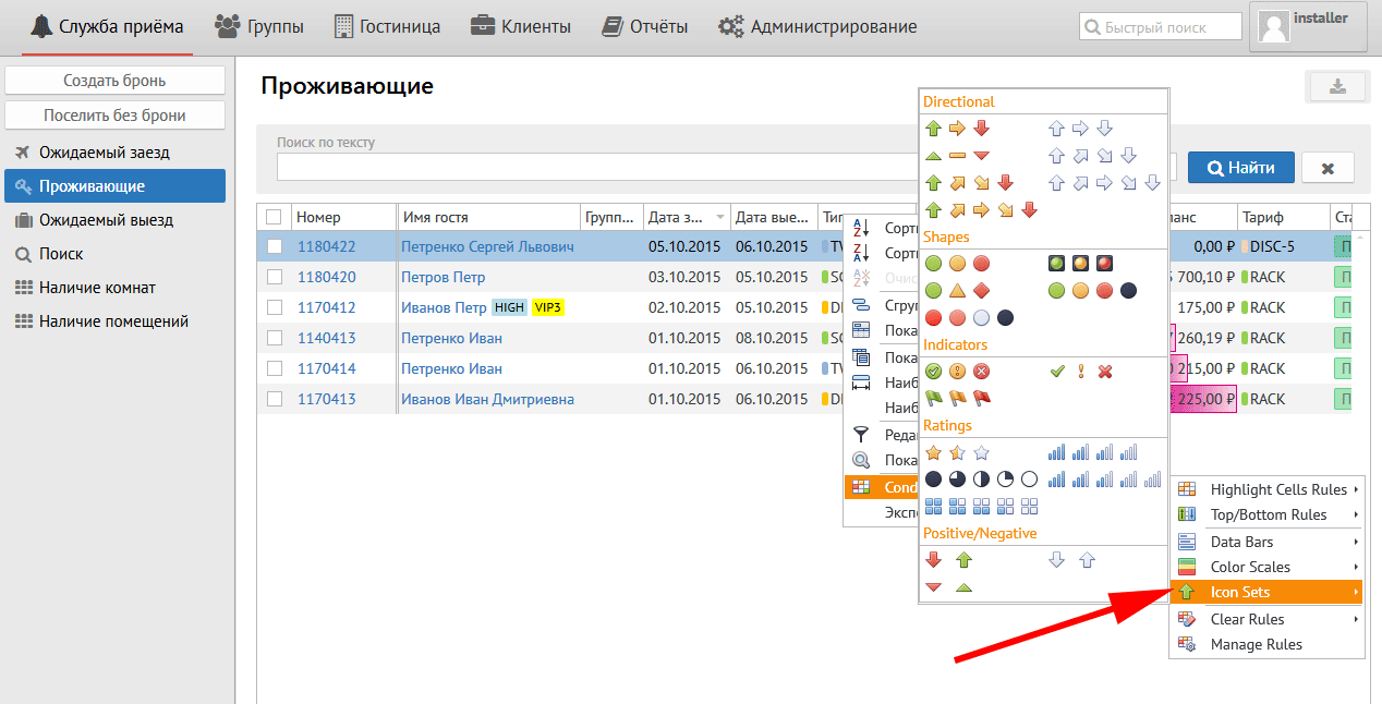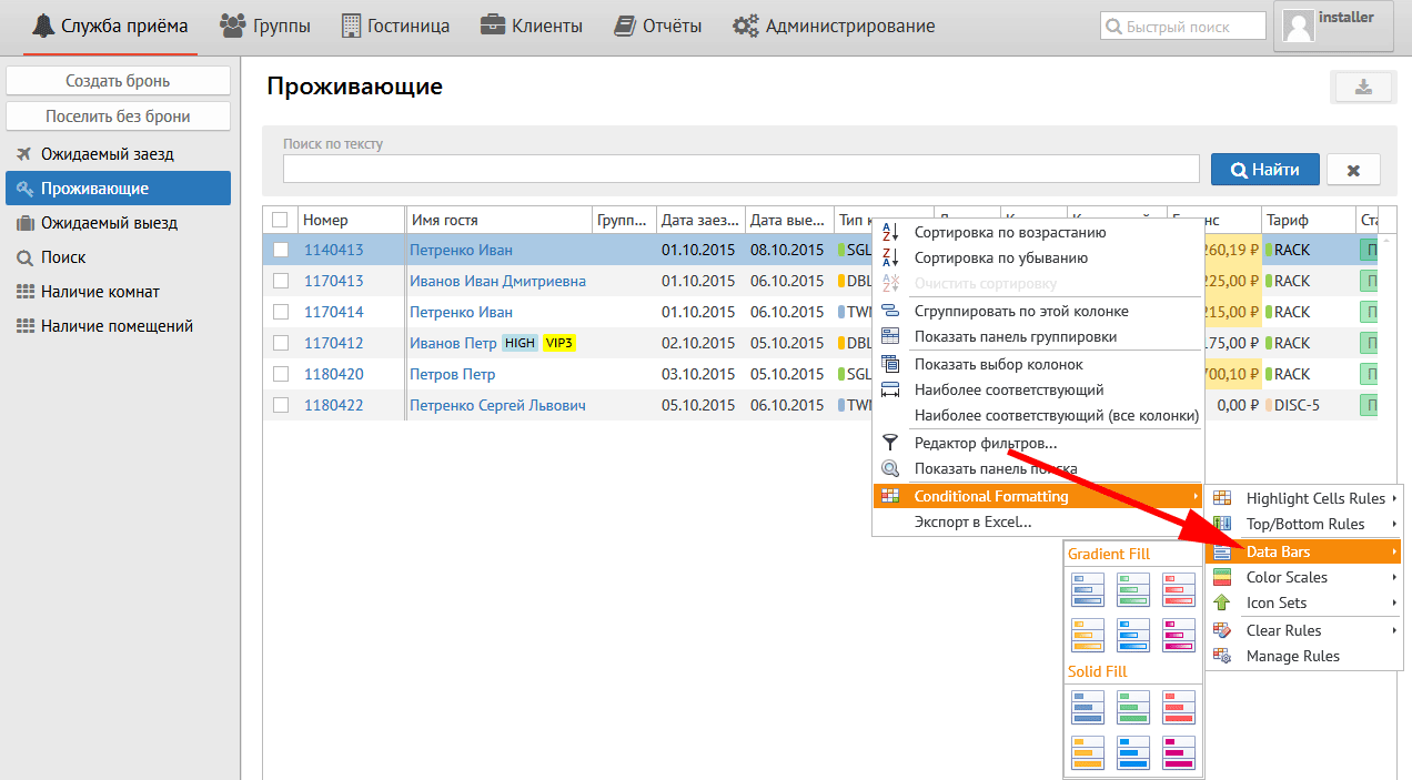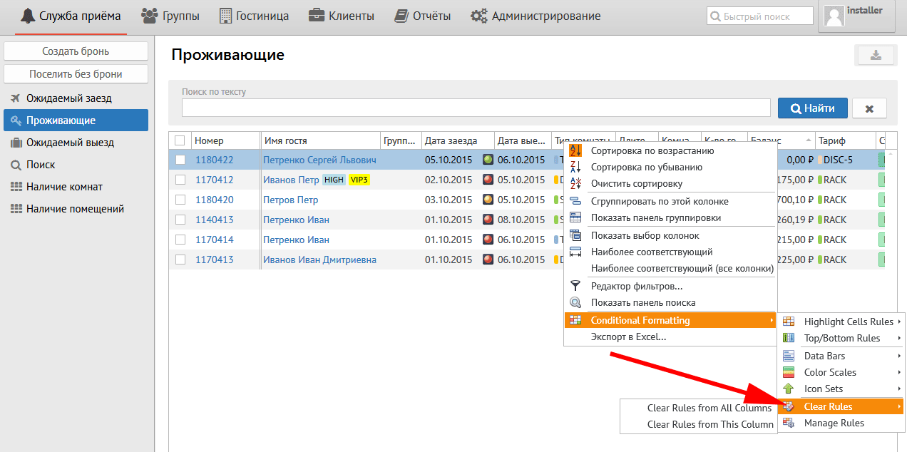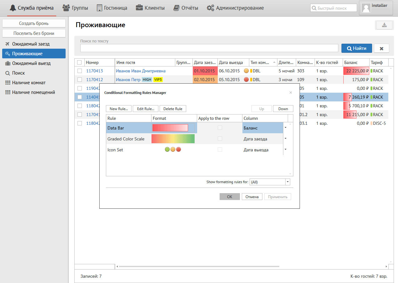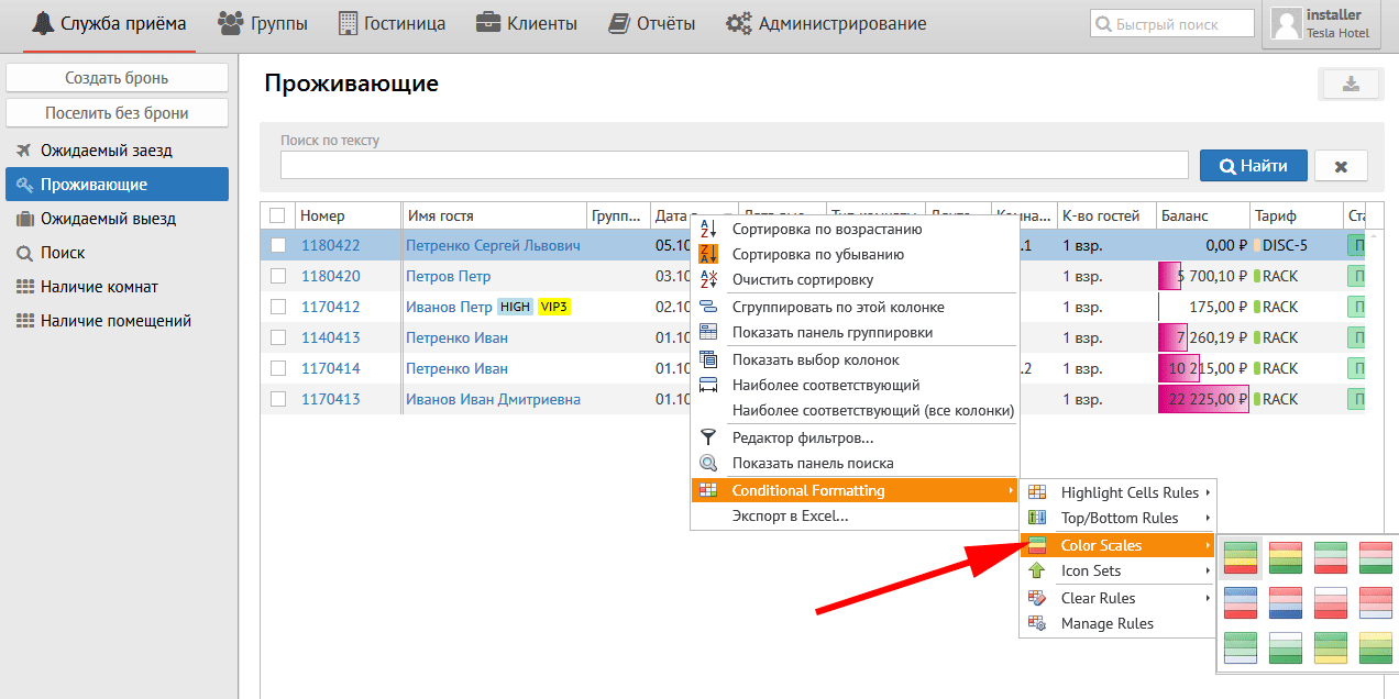 Установленные параметры позволяют выделить светло-красным цветом ячейку или строку гостя, баланс которого более 1000 руб.