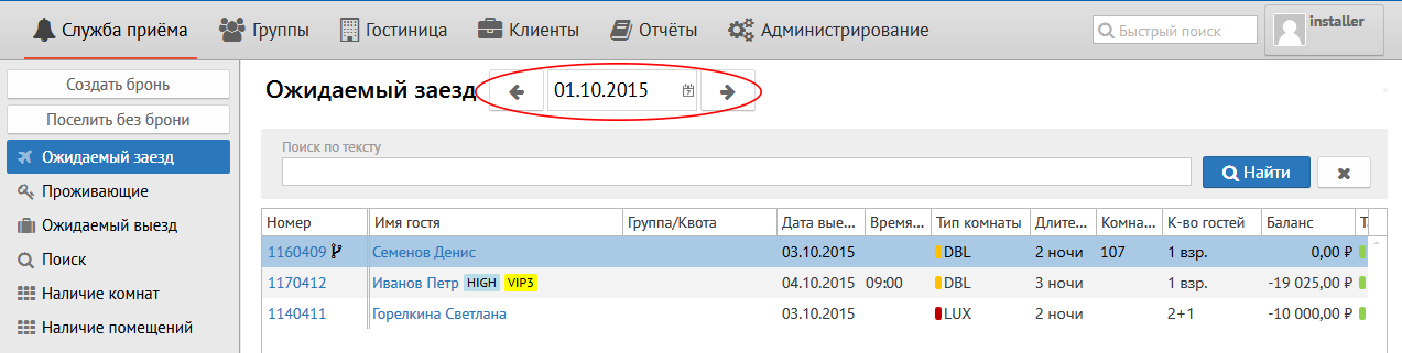 Кнопка «Ожидаемый заезд» показывает список гостей, ожидаемых к заезду в Вашем объекте. Вверху Вы можете изменять дату, указывая необходимую. Для удобства пользования по обе стороны от даты есть стрелочки -> и <-, которые помогают быстро пролистывать дату влево и вправо.