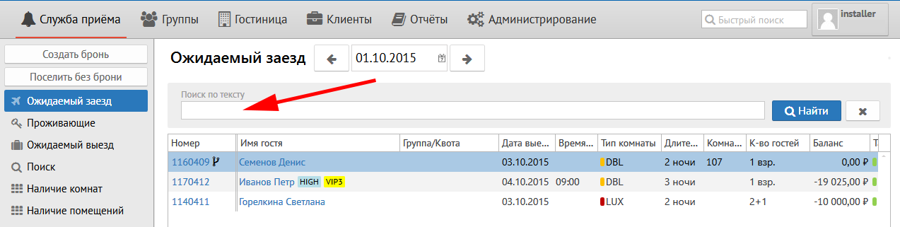Строка поиска, которая называется «Поиск по тексту», находится чуть ниже даты и позволяет искать необходимые Вам брони по имени гостей, № комнаты, № брони, № CRS и компании. После того, как Вы вбили данные в строку поиска, нажмите кнопку «Найти». Кнопка «Х» сбрасывает фильтры поиска.