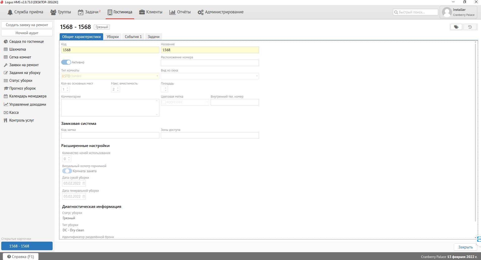 На вкладке "Общие характеристики" видна информация о комнате без права редактирования. В сетке комнат ничего не редактируется, только визуальный просмотр.