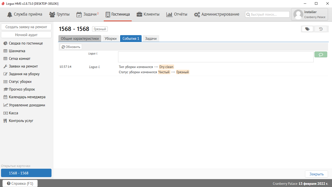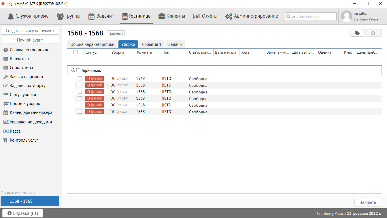 Далее, на вкладке "Уборки" видна история уборок, которые проводились в комнате: