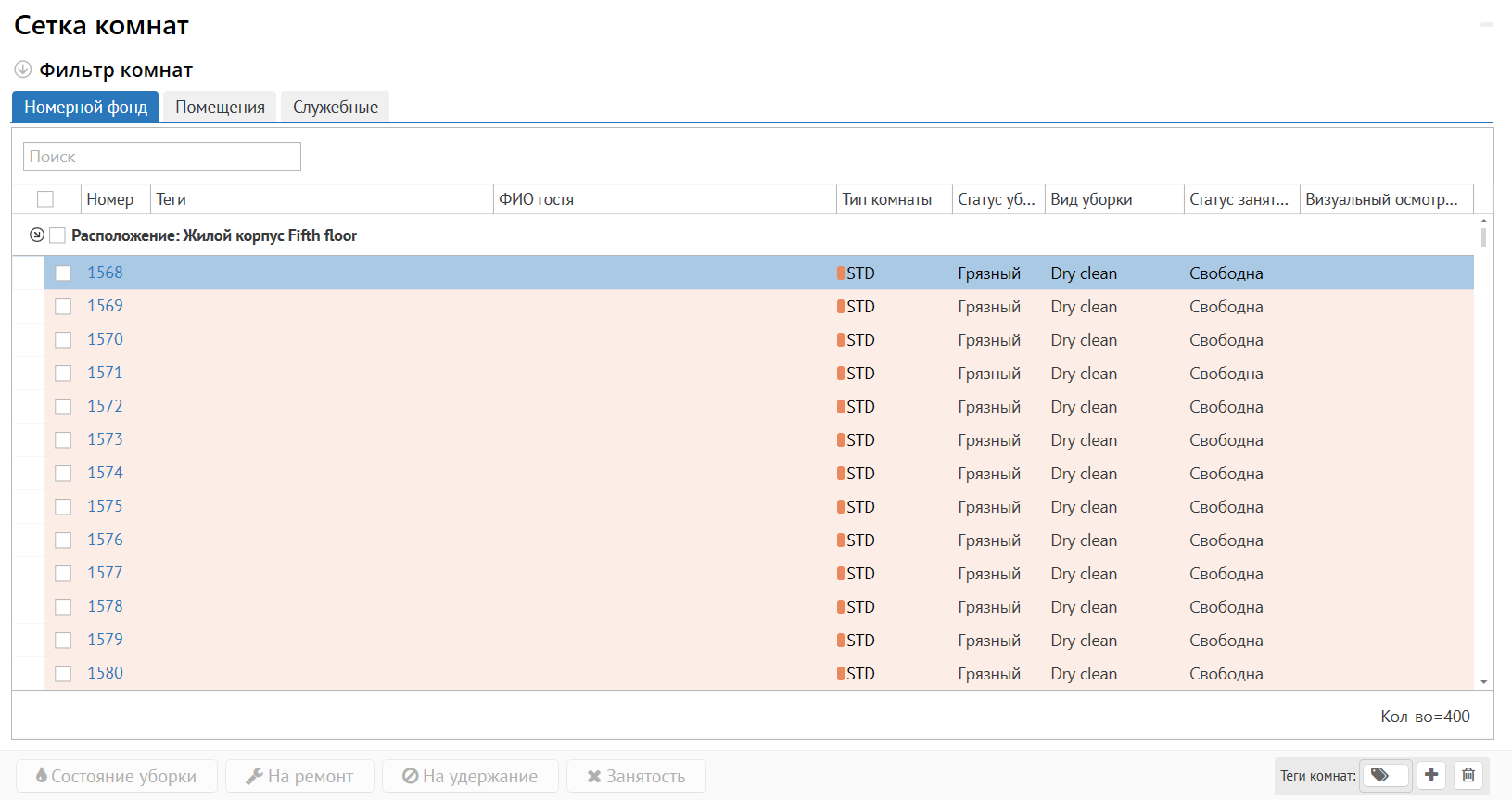 Сетка комнат позволяет просматривать информацию по номерному фонду без вмешательства в процессы бронирования. Данный экран предназначен, в большей степени, для инженерной службы, и содержит минимум информации о гостях, в отличие от Шахматки.