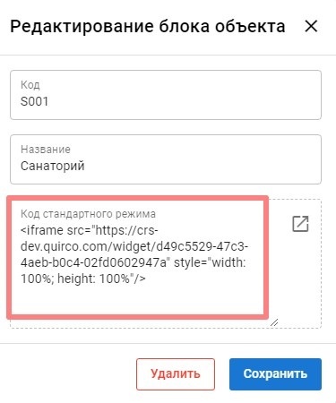 По нажатию на название блока в открывшемся окне необходимо скопировать содержимое поля "Код стандартного режима" для вставки в нужное место сайта объекта.