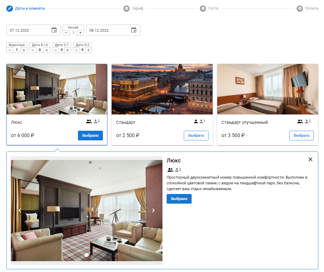Доступные для выбора категории гостей (Взрослые/Дети 8-14/Дети 3-7 и т.д.), информация о номерах (вместимость, фото, описание и т.д.) настраиваются в настройках объекта в разделе Администрирование CRS. Подробнее: Раздел "Администрирование".