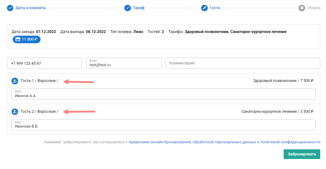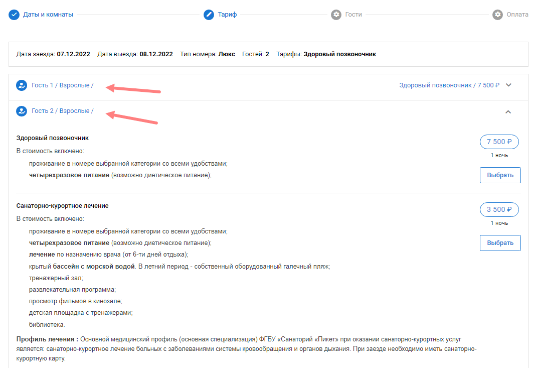 Тарифы можно выбрать отдельные для каждого гостя в брони: