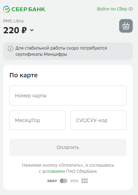 После нажатия кнопки "Оплатить ..." гость будет перенаправлен на форму банка для ввода данных карты и оплаты.