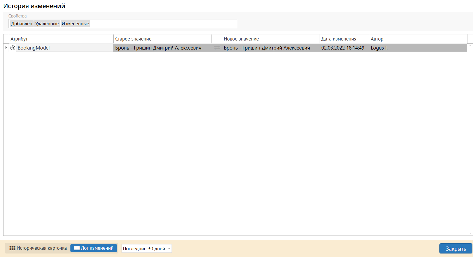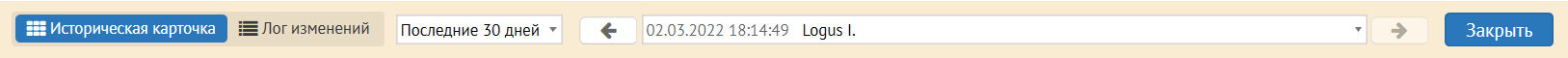 Историческая карточка - просмотр произведённых изменений на конкретные дату и время. Задаётся интервал (7 или 30 дней, год, всё время), после которого в поле слева выводятся все записи по сохранениям. При выборе определённой записи в полях карточки брони отображаются данные на установленные дату и время сохранения. Таким образом можно посмотреть все изменения, которые были произведены в брони.
