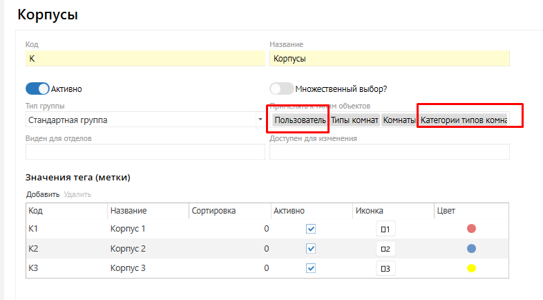 1.Создать тег с применимостью Пользователь и Категория типов комнат. Обычно, такие теги указывают закрепление корпуса за Пользователем: