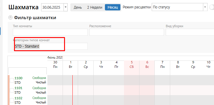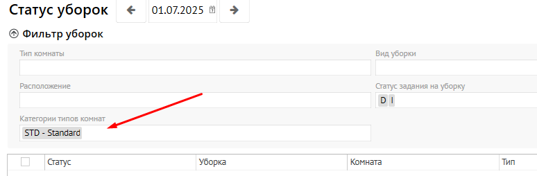 2. После этого, при входе через этого Пользователя, фильтр Категория типов комнат в Шахматке, Сетке комнат, Заданиях на уборку, Статусе уборок будут заполнены той категорией, которая привязана тегом к данному Пользователю: