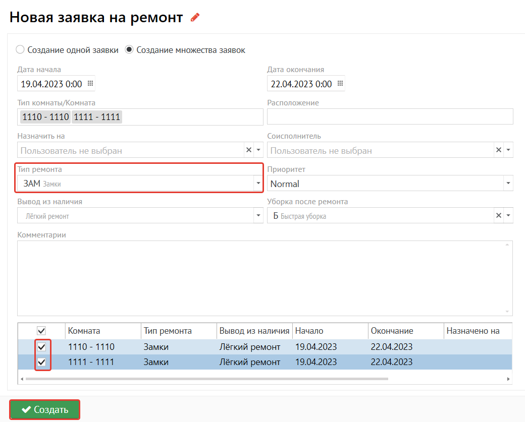 Кнопка "На ремонт" - позволяет поставить комнату на полноценный ремонт. Обязательное поле "Тип ремонта".