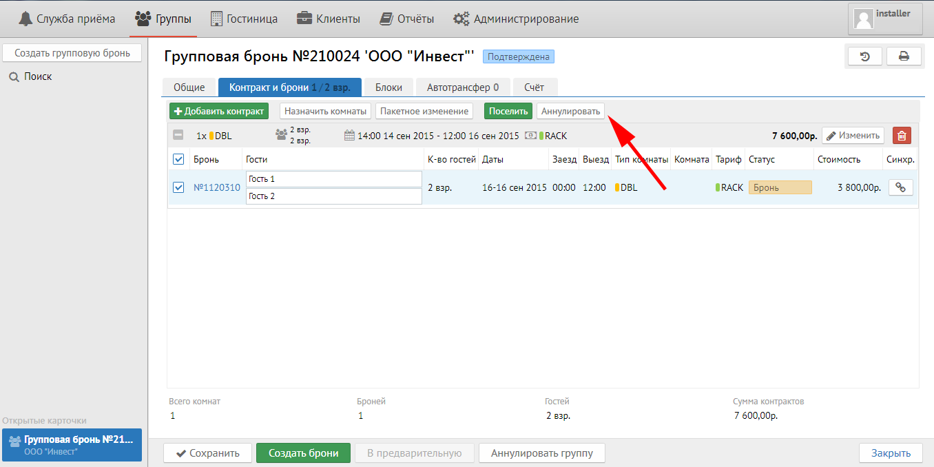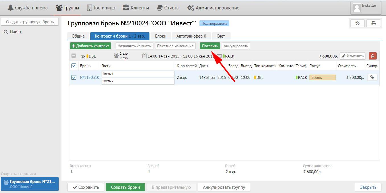 Важно: сколько в группе вариантов размещения (даты,  типы номеров, количество номеров), столько контрактов должно быть в группе.