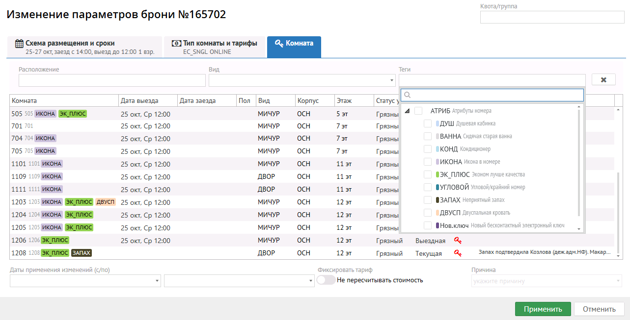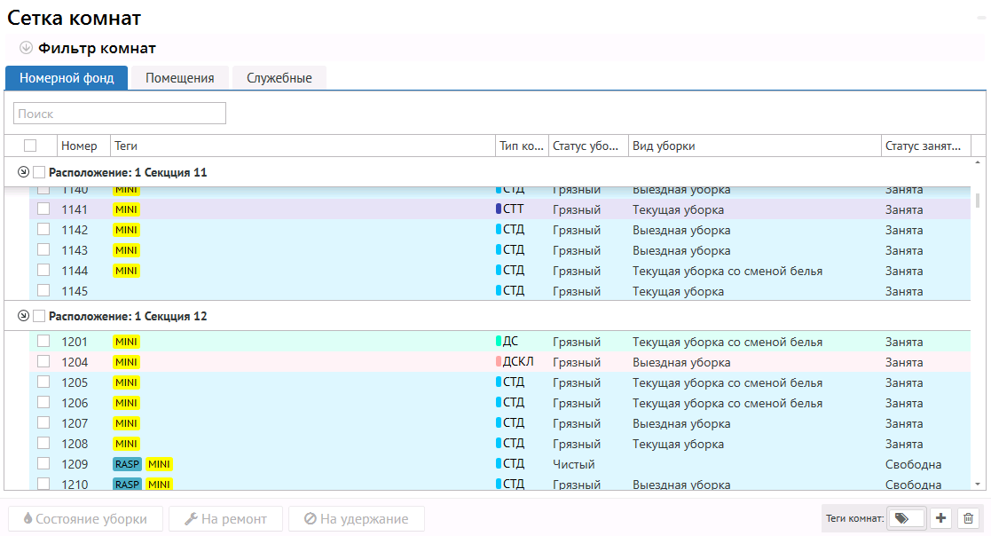 Назначение тегов комнатам (кровати раздвинуты, сдвинуты, в номере заполнен мини-бар, в номере запах) позволяет всем службам иметь наглядную картину состояния номерного фонда.