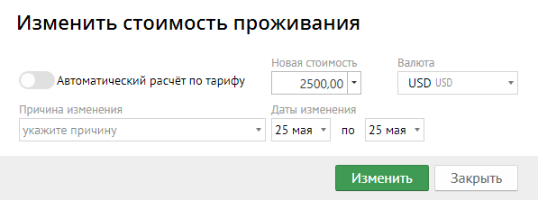 Появилась возможность изменять стоимость проживания для валютных тарифов: