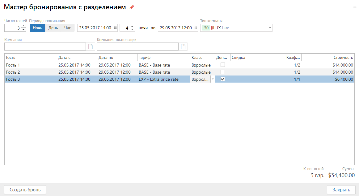 Чтобы облегчить предварительный расчёт броней с разделением (когда гости проживают по различным тарифам, и на допместах), появился новый мастер бронирования. Он позволяет указать разные дати, тарифы и другие параметры для каждого гостя, осуществить расчёт стоимости, а при необходимости и создать разделённую бронь одной кнопкой.