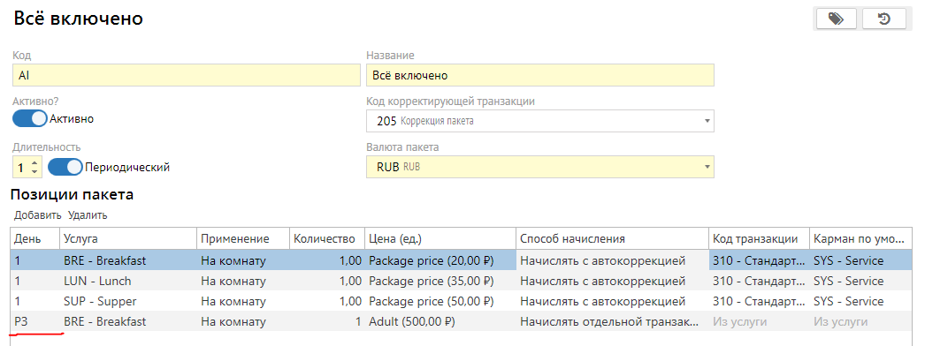 При формировании услуг пакетного предложения в качестве номера дня можно указать "РЗ" (ранний заезд) или "ПВ" (поздний выезд). Это позволяет автоматически добавлять услуги на интервалы раннего заезда или позднего выезда. Например, добавлять завтрак на ранний заезд и обед на поздний выезд: