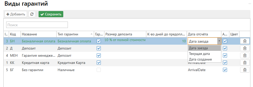 Для каждого вида гарантии в качестве Даты отсчёта могут быть выбраны разные варианты: Дата заезда, Текущая дата и Дата создания брони.
