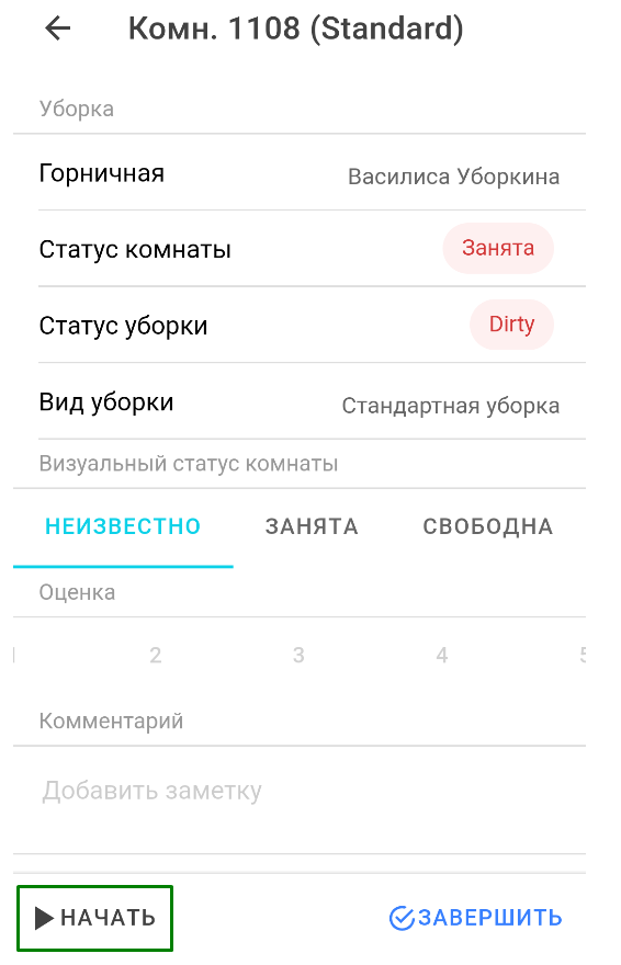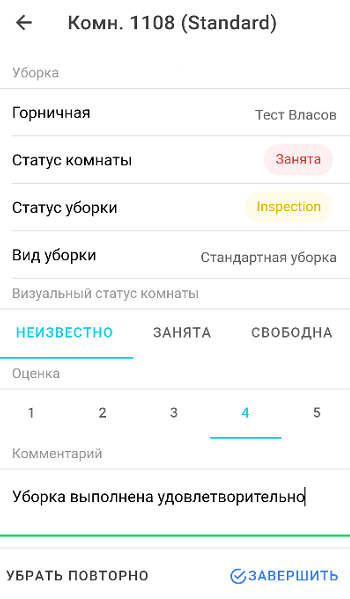 В момент проведения инспекции с мобильного приложения, инспектор (с активированным правом "Инспекция уборок") имеет возможность выставить оценку качеству проведённой уборки (в баллах от 1 до 5), а также добавить текстовый комментарий.