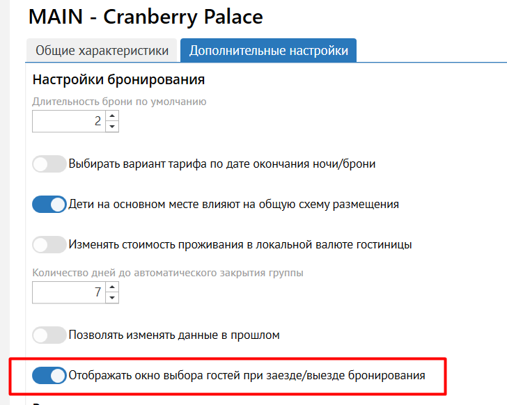 1.В настройках Объекта нужно включить чекбокс, отвечающий за отображение окна выбора гостей при поселении и выселении бронирования(настройка в отключенном состоянии отрабатывает, как было ранее: выселение и поселение применяется ко всем гостям в брони):