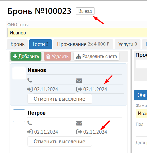 При нажатии на кнопку Выселить будет установлена дата выезда для выбранного гостя и бронирование перейдет в статус Выезд, если у всех гостей заполнена дата выезда: