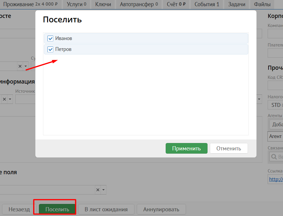 При нажатии на кнопку Поселить/Выселить, бронь, при включенной настройке, будет отображать окно выбора гостей: