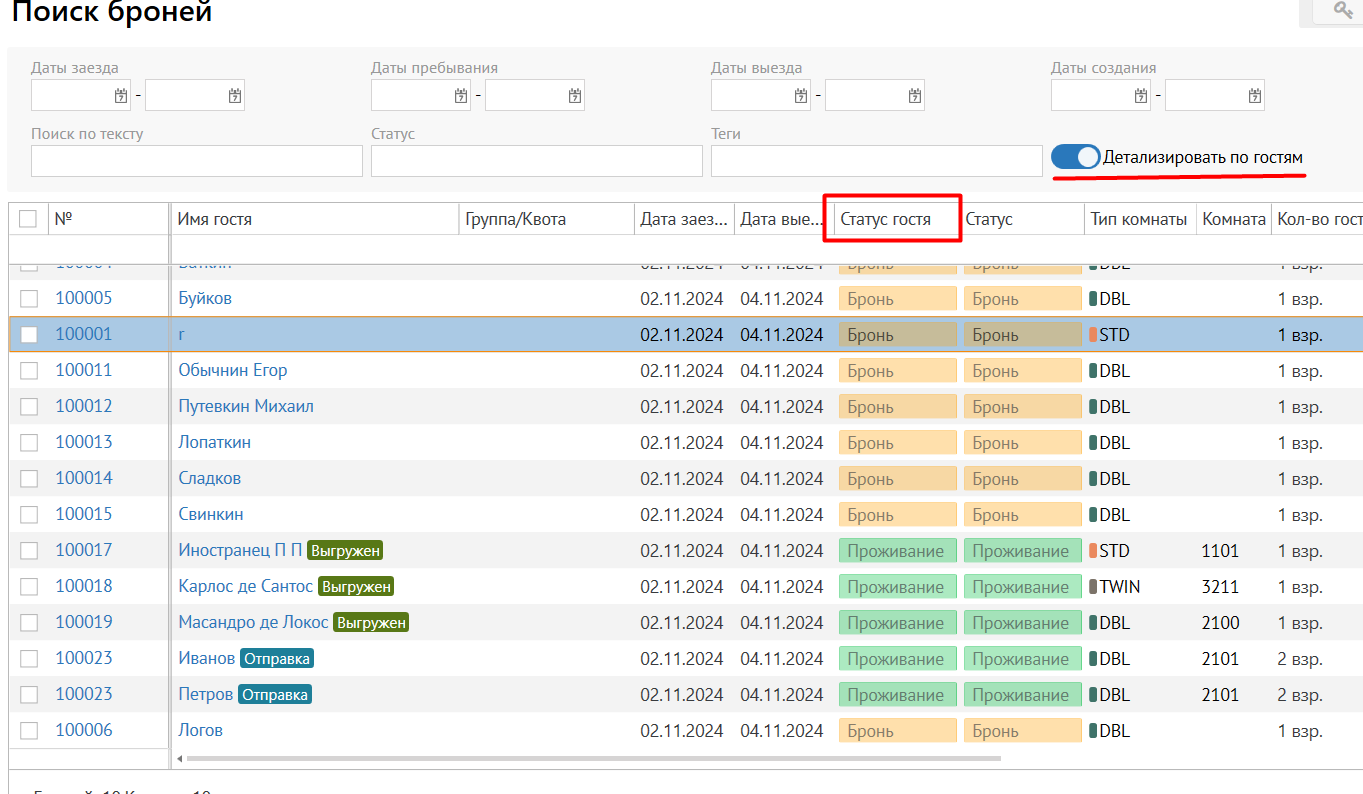 Во всех остальных случаях, Статус гостя соответствует Статусу бронирования