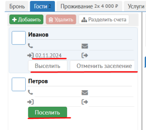 При нажатии на кнопку Поселить, в списке гостей на вкладке Гости будет установлена дата заезда для выбранного гостя и бронирование перейдет в статус Проживание, если еще не находится в этом статусе: