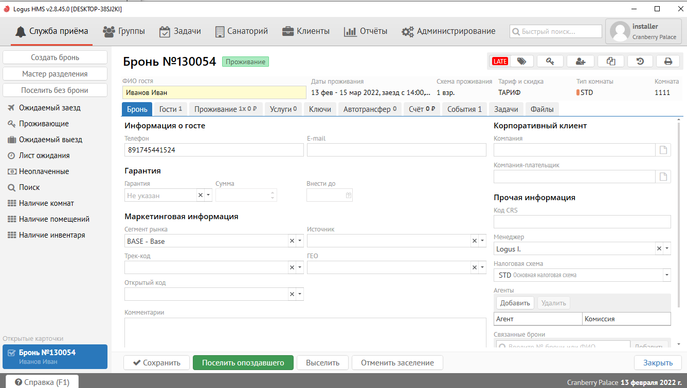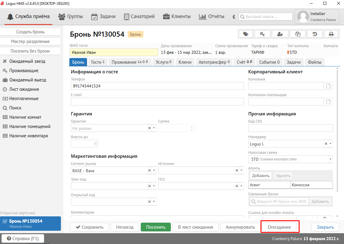 2. Когда гость приедет на объект, необходимо "Поселить опоздавшего" (тег LATE снимается автоматически).