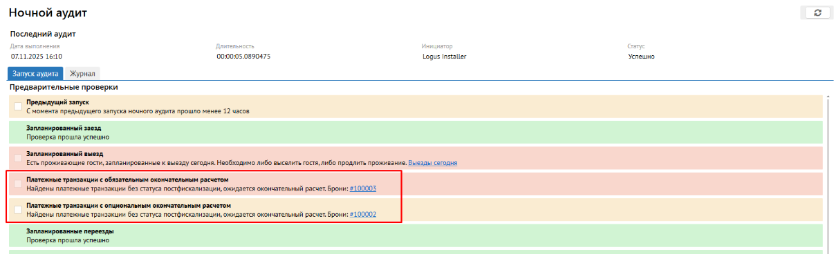 • Проверка перед проведением Ночного аудита проводится для всех счетов в статусах Out, TemporaryOut, NoShow, ReservationStatus.Cancel, у которых дата закрытия совпадает с текущей датой гостиницы.