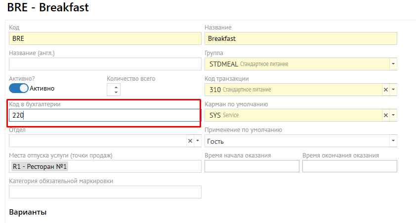 Код в бухгалтерии — задает код проводки при выгрузке в 1С.