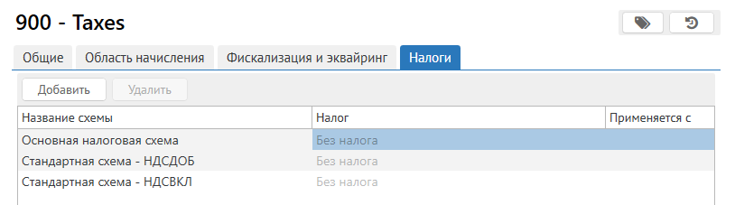 Здесь отображается таблица (с полями: Название схемы, Налог, Применяется с), в которой указывается, какие налоги применяются к транзакциям с данным кодом. Для каждой налоговой схемы предусмотрена отдельная строка, где можно указать дату начала её применения.