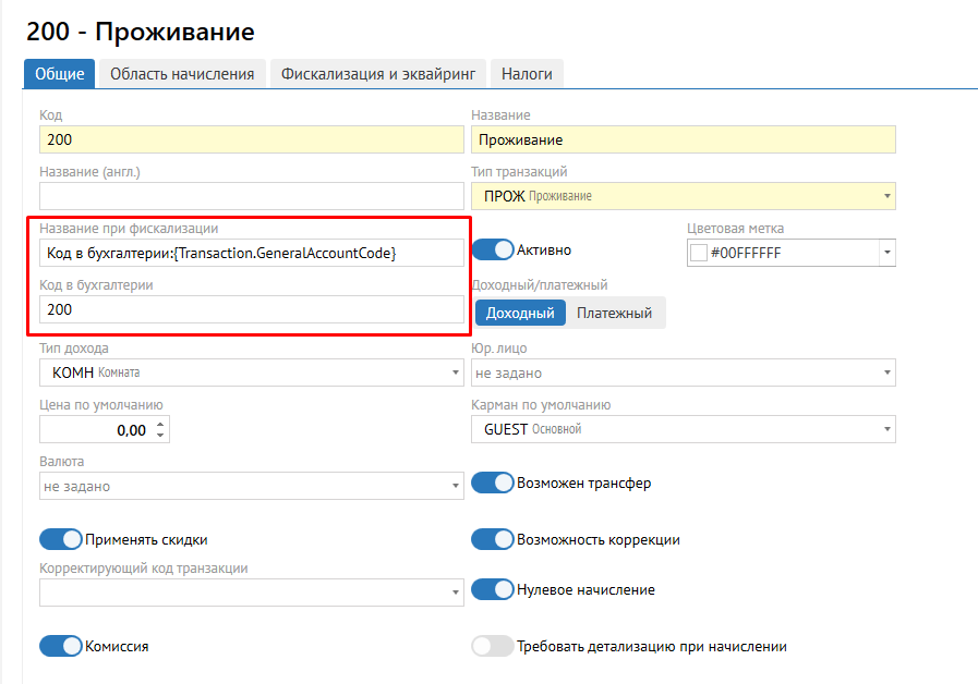 Чтобы в чек вывелось значение данного поля из Услуг или кода транзакции, если транзакция начислена без услуги, в справочнике Коды транзакций в поле Название при фискализации необходимо прописать {Transaction.GeneralAccountCode}: