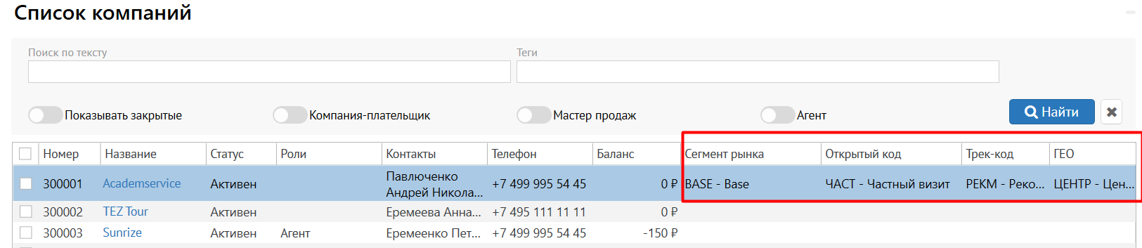 Для возможности отслеживать незаполненные маркетинговые данные по компаниям, не заходя в саму карточку компании и выгружать эти данные, добавлен вывод маркетинговых данных в список: