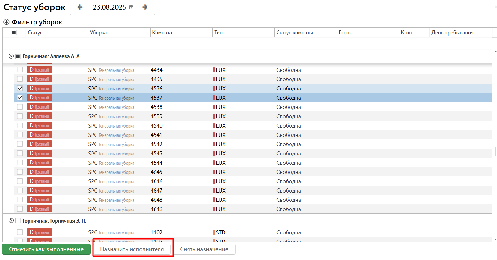 1.На экране выбрать уборки и нажать кнопку Назначить исполнителя: