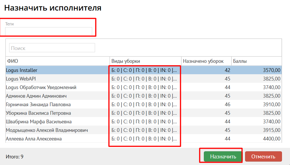 2. В окне назначения есть возможность отфильтровать по тегу и посмотреть, какие уборки были назначены и сколько всего уборок было назначено. После выбора нужной горничной, необходимо нажать кнопку Назначить: