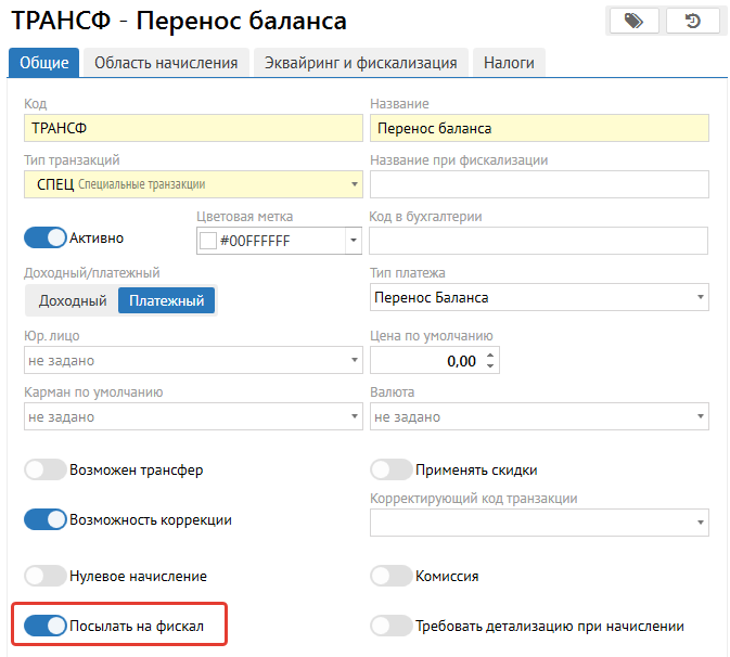 Настройка в коде транзакции на вкладке "Фискализация и эквайринг".