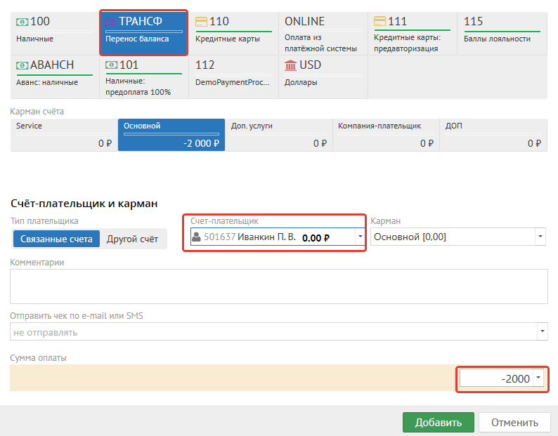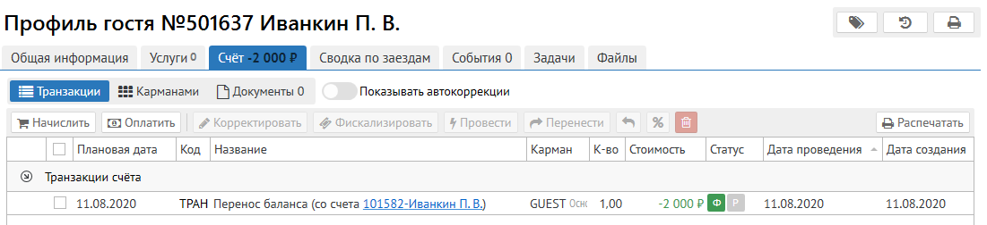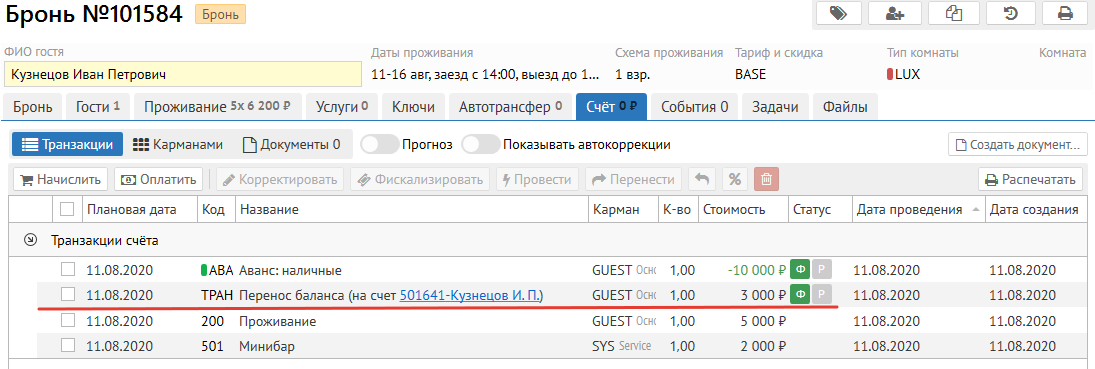 - Выбрать счет для трансфера части аванса (например профиль гостя), указать сумму остатка, который нужно перенести