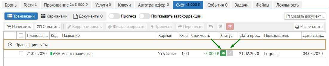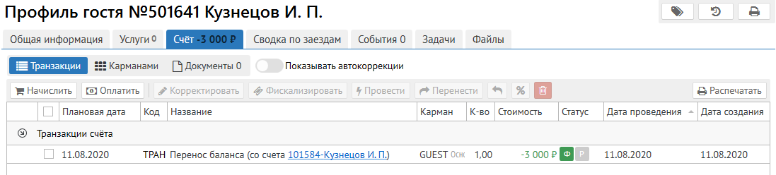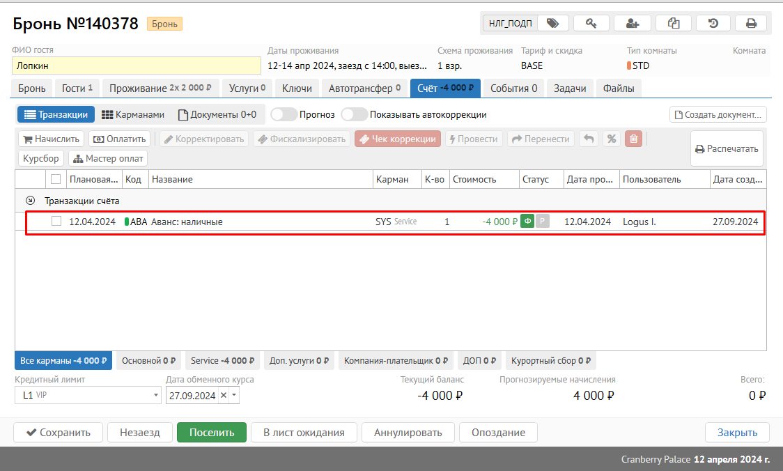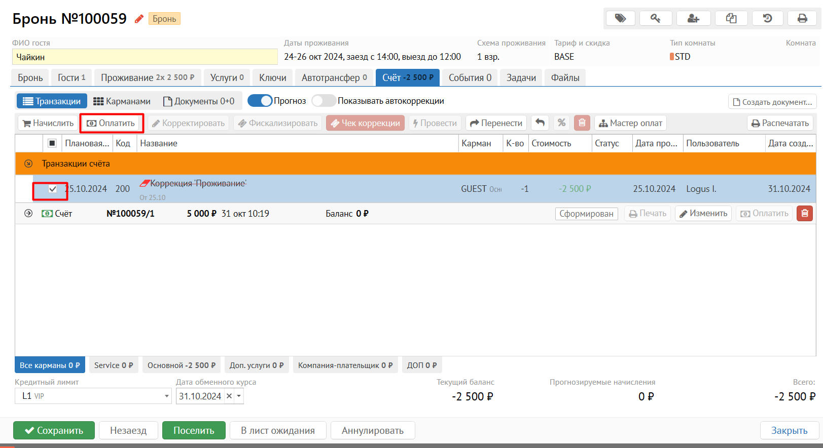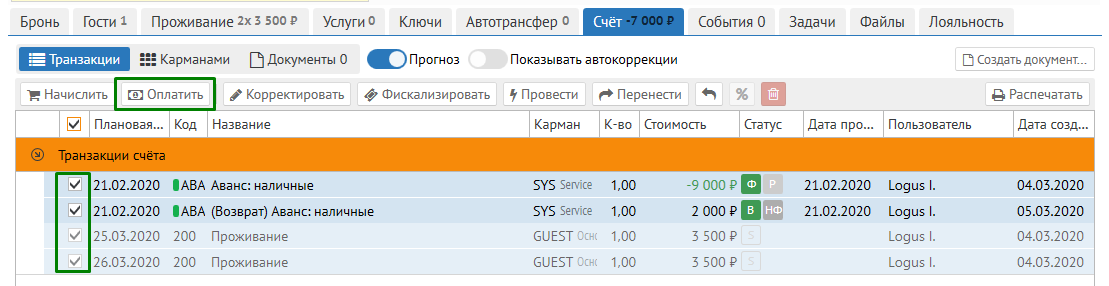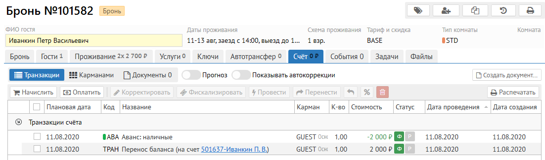 - Выбрать счет для трансфера аванса (например профиль гостя)